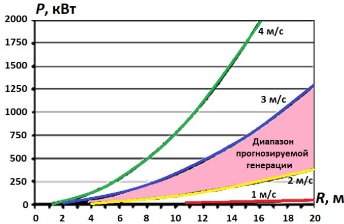 Рис. 12: Выработка электроэнергии в зависимости от диаметра ротора и скорости потока
