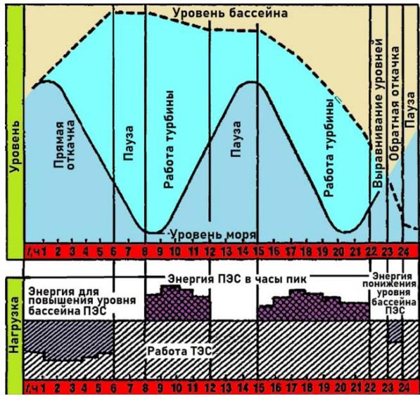 Рис. 1: Энергетические диаграммы ПЭС уровне, и они будут работать в составе единой энергосистемы (рис. 1)). При приливно-отливном движении воды образуется солитон с амплитудой прилива до 6 м на Севере и 13 на Дальнем Востоке, что соответствует низконапорным ГЭС, однако, поскольку сейчас в приоритете атомные проекты, даже низкая себестоимость производства энергии и безопасность для окружающей среды, B сравнении углеродной энергетикой, не стали аргументом для разработки новых проектов строительства приливных станций. И, казалось бы, в таком контексте, актуальность темы должна
