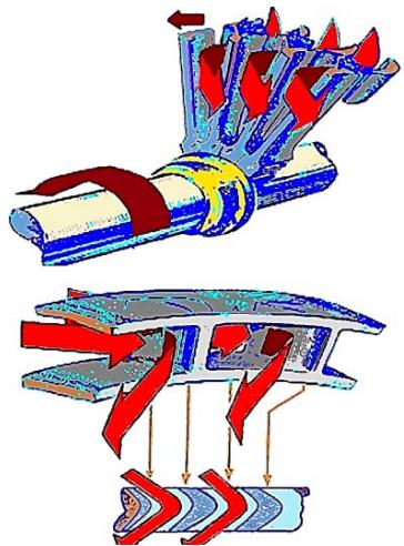 Рис. 11: Принцип передачи количества движения с решётки на лопасти рабочего колеса