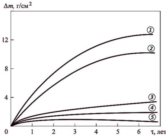 Рис. 13: Интенсивность коррозии конструкций в воде разных морей: 1 – Северном; 2 – Средиземном; 3 - с высоким содержанием Са и загрязнённая сточными водами; 4 – без загрязнений; 5 – Чёрном[9]