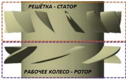 Совмещение посредством рабочей (направляющей) решётки – статора, формирующего направленный на лопасти поток как из диффузора (рис. 11), требует отдельного расчёта, и после определения $C _ { 1 }$ и и, выбора угла $a _ { 1 }$ вычисляют относительную скорость $W _ { 1 }$ на входе в рабочую решётку: $\mathtt { W 1 } = \mathtt { C } 12 + \mathtt { u } 2 - 2$ C1ucos 1, и определения угла $\beta _ { 1 }$ по формуле 1=sin 1 сos 1 - иС1, - после оценки относительной скорости на выходе