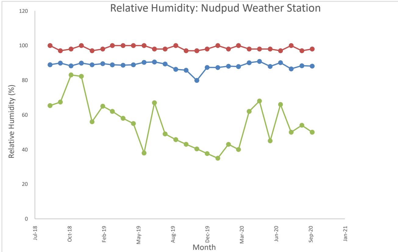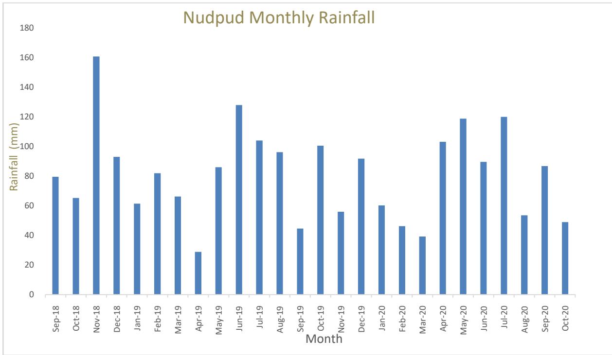 The month with the highest rainfall recorded in the Nudpud area is November 2018, while the other months the precipitation has been moderate to high.