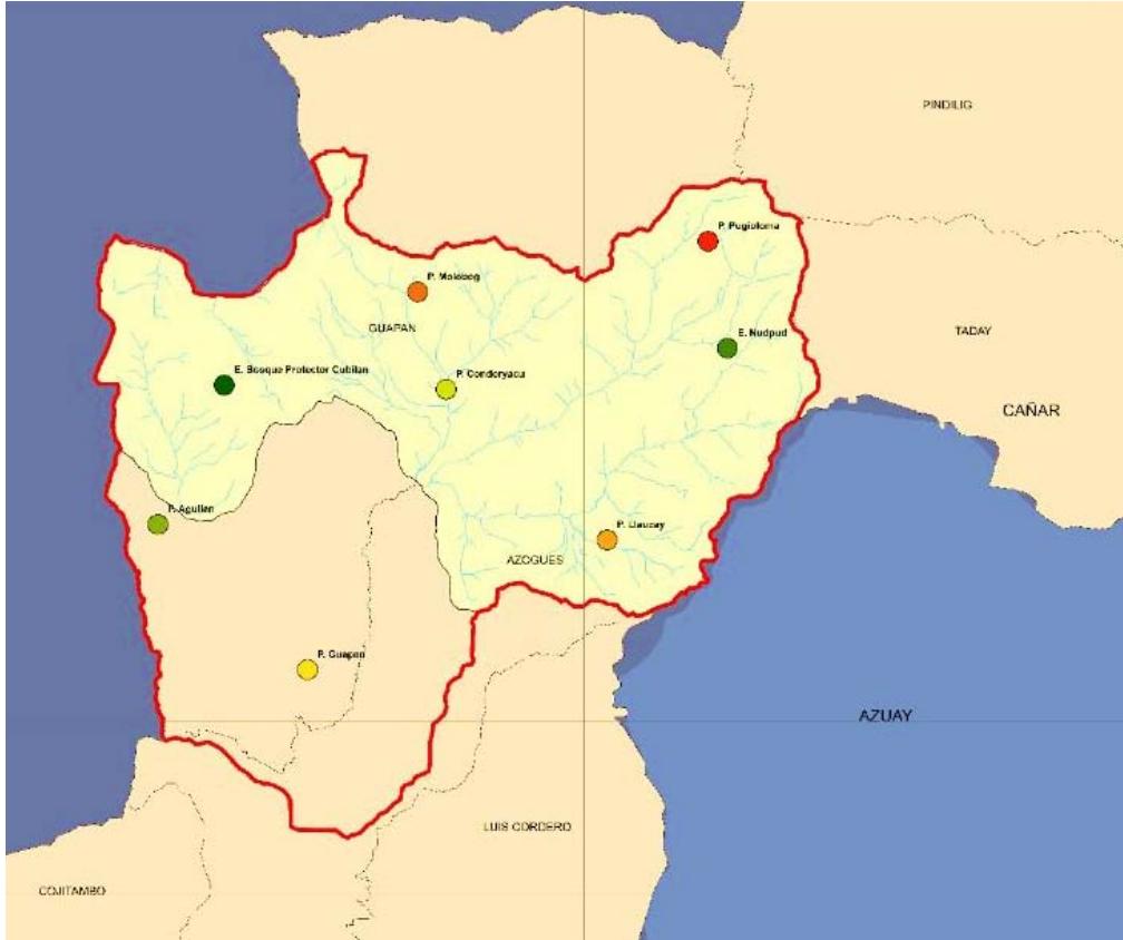 For the Tabacay micro-basin the main tributaries are the Llaucay, Nudpud, Condoryacu, Rosario, Mapayacu and Rubis streams. The micro-basin has an area of 6650 hectares (66.5 km2) and administratively belongs to the Azogues county and is divided into 2 parishes: Guapán and Bayas.