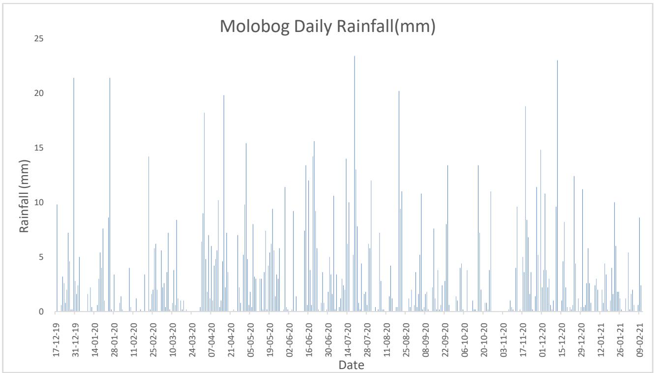 The months of greatest rainfall recorded in the Molobog area are in the months of January, July, and December of the year 2020, while in the other months there is moderate to high rainfall in the area.