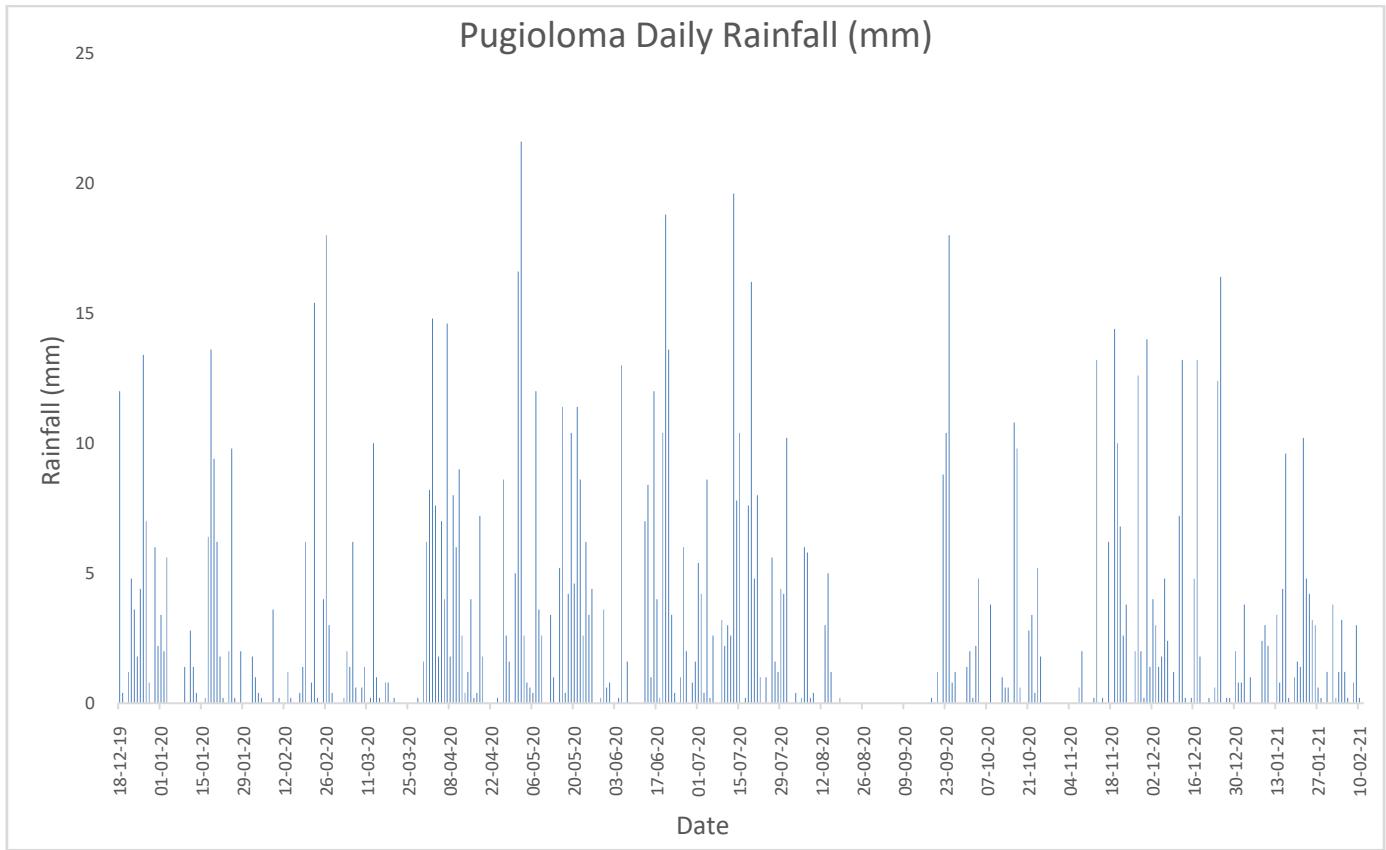 The months of greatest rainfall recorded in the Pugioloma area are in the months of April, June, July, and December of the year 2020, while in the other months there is moderate to high rainfall in the area.
