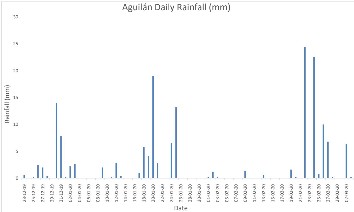 The months of greatest rainfall recorded in the Aguilán area is in the month of February of the year 2020, while in the other months there is moderate to high rainfall in the area.