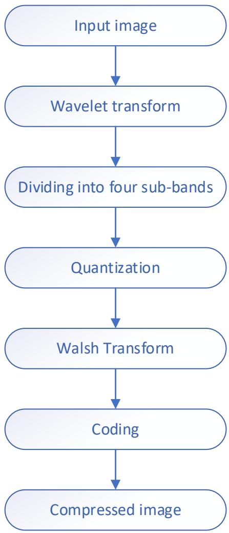 Image transfer and storage require compression to reduce memory usage and increase transmission speed. In this article, the hybrid compression algorithm is used for color/black and white images. It includes the discrete wavelet transform and the Walsh transform. The Walsh transform coefficients are quantized and arithmetically encoded. The combined output is compressed and can be transmitted over any available network in the shortest time. The compressed image is decoded and the original image is decompressed using the inverse conversion operation.