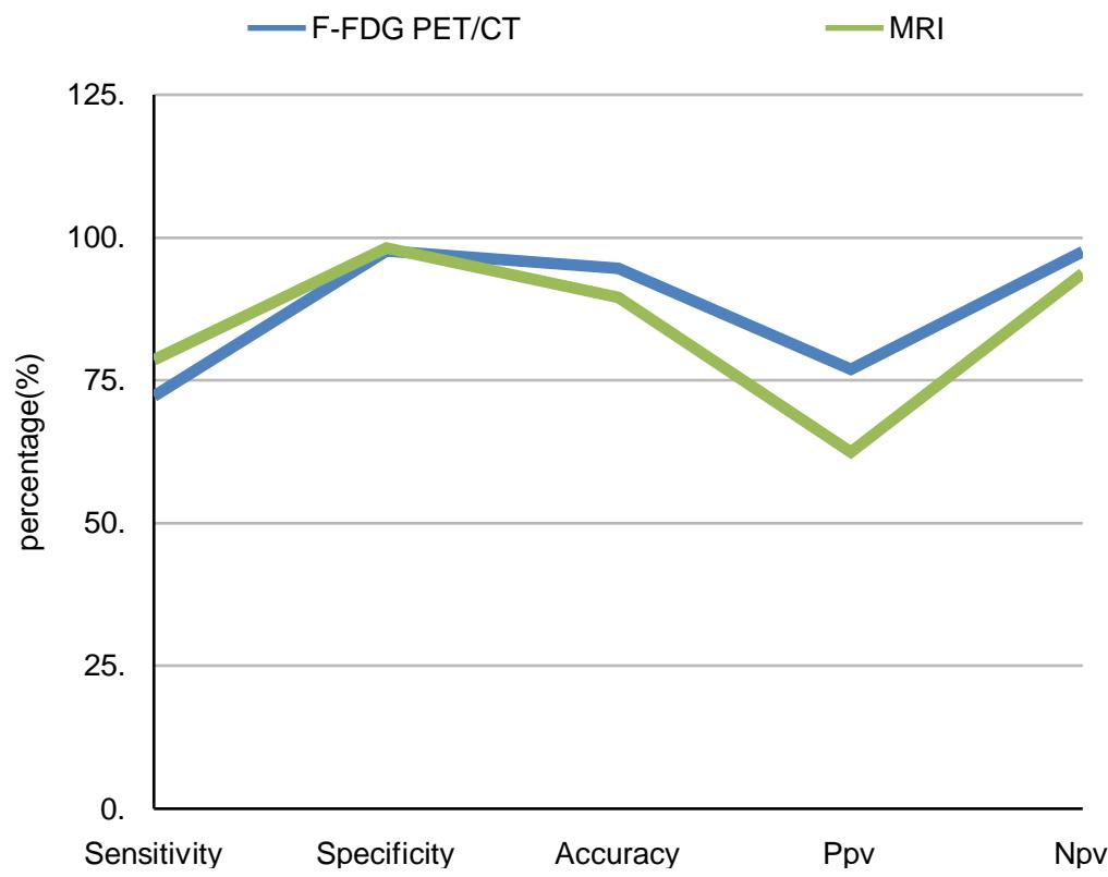 <table><tr><td></td><td>F-FDG PET/CT</td><td>MRI</td></tr><tr><td>Sensitivity</td><td>72.2</td><td>78.6</td></tr><tr><td>Specificity</td><td>97.6</td><td>98.2</td></tr><tr><td>Accuracy</td><td>94.6</td><td>89.6</td></tr><tr><td>Ppv</td><td>76.9</td><td>62.5</td></tr><tr><td>Npv</td><td>97.5</td><td>93.7</td></tr><tr><td>Positive LR</td><td>19.6</td><td>10.9</td></tr><tr><td>Negative LR</td><td>0.46</td><td>0.68</td></tr></table>