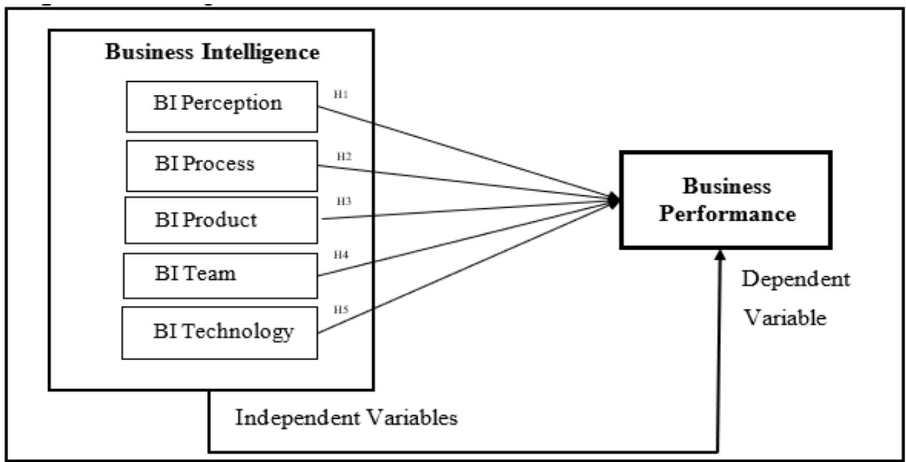 The conceptual framework has been developed in relational to the developed hypothesis based on the findings in past literature reviews. Figure 1 illustrates the relationship between research variables. Business Intelligence was used as an independent variable and