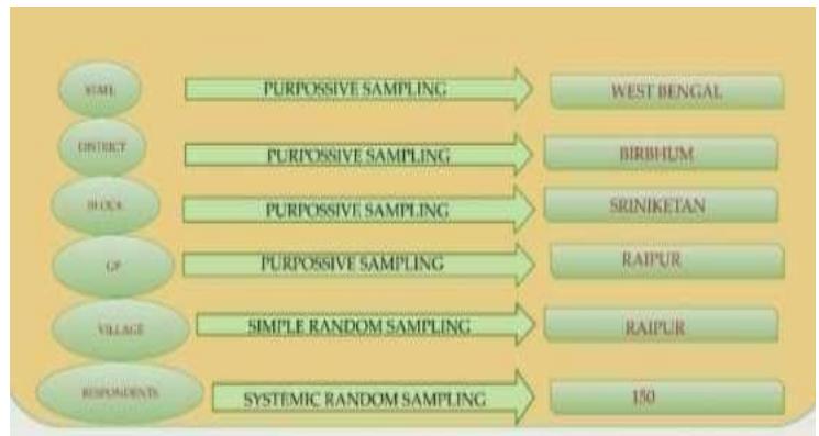 This study was conducted in Raipur Gram Panchayet and village, Sriniketan block, Birbhum district of West Bengal. Total 150 farm families were selected for the study with a class interval of 3 (2.75 to be precise). The sampling method used for the study is as follows-