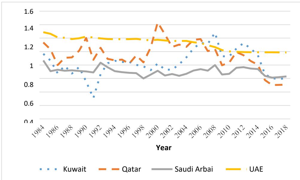 Figure (1) below shows the TFP in the selected four Gulf countries. The TFP of UAE faces fewer fluctuations than other countries over the period mentioned. TFP in UAE is high on average among the other countries, but there is a decrease in 2018 compared with the 1984 value. As in 1984, the TFP of UAE was 1.28 and 0.98 in 2018, showing a sharp reduction over the period. The TFP is high in Qatar, followed by KSA and UAE, but it also faced a sharp decrease, as it was 1.13 in 1984 and 0.51 in 2018. The TFP of Kuwait faced sharp fluctuations, mainly in the war period of 1991 when TFP reached its minimum level. Another massive reduction in the TFP of Kuwait was from 0.96 in 1984 to 0.61 in 2018. KSA's TFP was 0.86 in 1984 and 0.63 in 2018. Moreover, Qatar faced a huge reduction in TFP in the studied period; it was 1.13 in 1984 and 0.51 in 2018.
