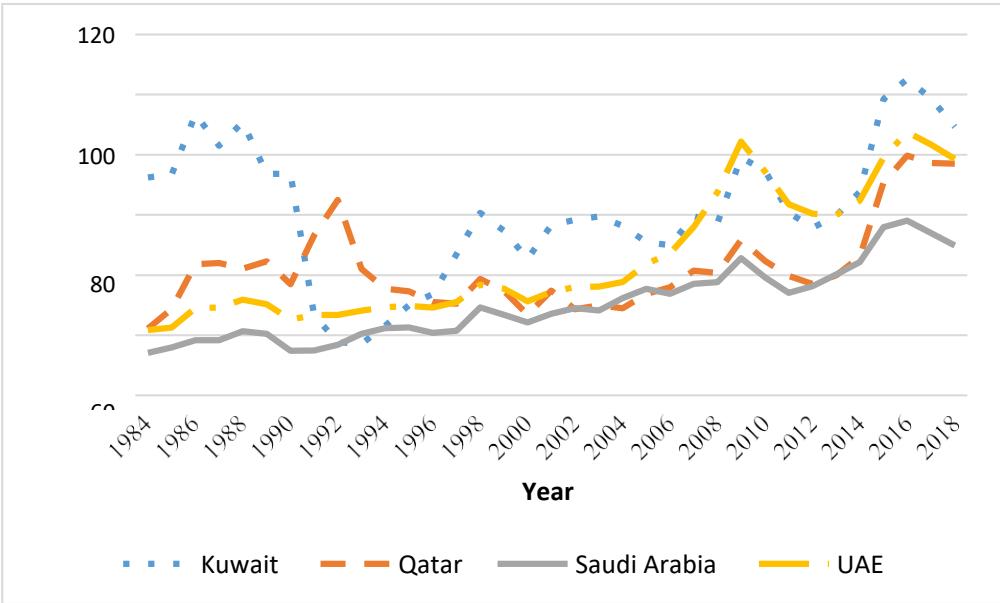 FD in Kuwait was 17.16 in 1993, which was post-war, while the highest level was in 2016 compared to the other countries. FD in Kuwait was 72.43 in 1984 and 89.32 in 2018. The trend of FD in Qatar shows an average level among other countries; it was 28.77 in 1984 and 77.06 in 2018. KSA's financial development trend increased over the period. It was 14.14 in 1984 and 49.83 in 2018.