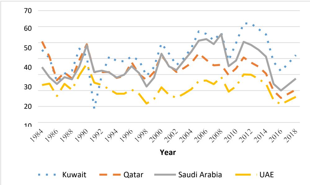 Furthermore, figure (3) shows that the trend of resource rents had sharp fluctuations in approximately all the studied countries over the period from 1984 through 2018, where the lowest level was for UAE and the highest level was for Kuwait except in 1991. Kuwait's resource rents were 45.42 in 1984 and 42.13 in 2018.