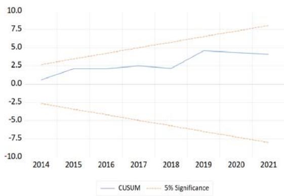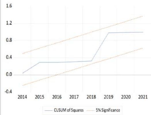 The CUSUM test shows that the line remains within the $5\%$ significance boundaries throughout the period from 2014 to 2021, indicating that the model's coefficients are stable over time. This stability suggests that the relationships between the variables have not significantly changed during the observed period. Similarly, the CUSUM of Squares test indicates that the variance of the residuals is stable over this period, implying that the model is homoscedastic, with constant variance in its errors, a desirable property in time series analysis.