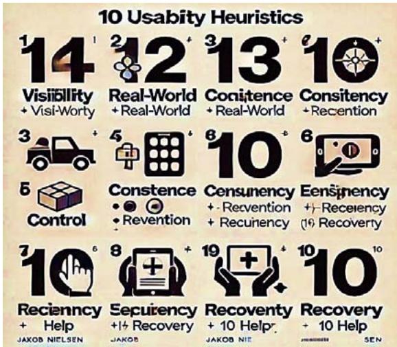 Regarding usability, Jakob Nielsen's heuristic (1994) can be mentioned as a metric, something easy and practical to handle, a tool that is simple to use. This definition, applied by Nielsen and Loranger (2007), underpins Nielsen's 10 Heuristics, which are not rigid rules but guidelines that help designers and developers create more intuitive, accessible, and user-friendly products (Figure 3).
