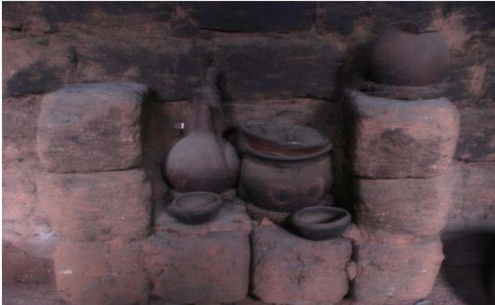 In every home in Kedjom society, te-nkəŋ shrine known as "altar" was built inside the kitchen with sundried bricks or raffia palm bamboos, attached to the wall of the kitchen. This shrine contained cultural artifacts such as calabashes, baskets and clay pots. The Kedjom people have asserted in their traditional and cultural beliefs that these artifacts represented Vunyingong (children of God) meaning the children of that family. This ritual was performed; if a child was born with umbilical cord wrapped round the neck considered as "single twin" or "weh nyingong", and when there was family problem and social illness within the family. Thus, shrines were places of consultation with esteemed extra-human forces to answer unanswered questions in order to calm fear and provide a way out to resolve problems.[^85] In the course of performing this rite, the head of the family called Njingga (successor) had a specific dressing style. He wore his cap, beads, held his drinking horn cup and creeping leaves called Lour were wrapped round his neck. Thus, all the children of the family sat inside the kitchen with each child having his or her own ritual names. Therefore, the objective was to wash out the misfortunes from the family. Some informants testify that the veneration of ancestors stood for cleansing and purification. This was not different from what Knöpfli's assertion that the motivation for the veneration of ancestors was threefold. In the first place, ancestors were venerated by the living in order to obtain help from them. The living invoked the ancestors' help and protection against diseases and death. Again, people beseeched them for timely sunshine and rain to ensure a good harvest and for good fortune. Lastly, ancestors were venerated in order to forestall a possible outbreak of anger. The ancestors' anger may be aroused if the living abandoned a set of traditional values.[^86] Again, Aniago supports that as long as the ancestral spirits are pleased with proper sacrifices, propitiation and ceremonial attention, they are believed to guarantee life and amicable relationships in the community.[^87]