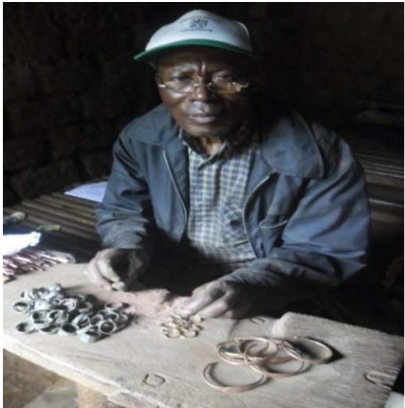 Ninying Robert Lobte, born in 1940, hails from Kedjom Keku and attended the Saint Peter's Practicing School Bambui. In 1954, he was trained as a blacksmith in Ndop precisely in Babungo. He got married to Miriam Lobte Akimbom in 1961 and is a father of nine children. He started blacksmithing in 1964 and was a founding member of the Cameroon Handicraft Company in Kedjom Keku 1967. He produced articles such as Dane guns, wine tapping knives, traps, axes, spears and cutlasses. The less lucrative nature of the business had forced him to specialize in producing rings, bangles, and local chains out of copper and brass.[^74]