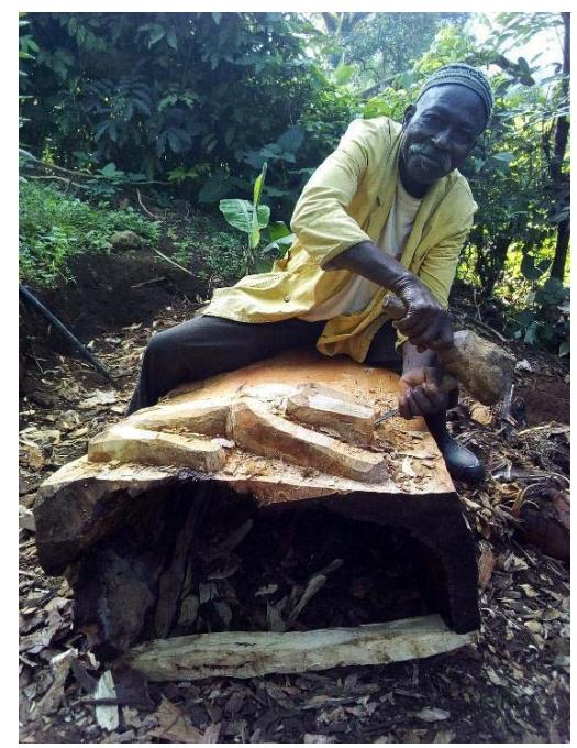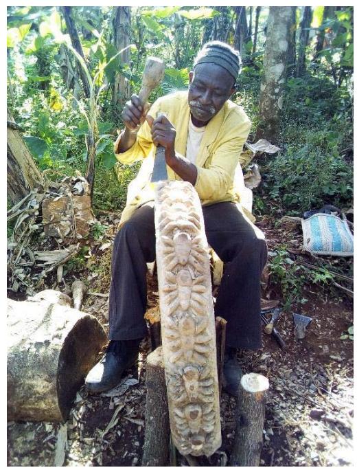 Additionally, the researchers also visited the woodcarving workshop located in the Ndeloh Quarter, which is owned by Vugah Joseph Vubangsi (see plate 10), the son of the late Fon Philip Vubangsi. His is widely recognized as a skilled and esteemed woodcarver within the fondom, and his exceptional craftsmanship has led him to participate in workshops held across Cameroon. Woodcarving holds significant cultural and religious importance in Kedjom, representing an integral part of the indigenous people's way of life and the daily practices of the craftsmen. This can be observed in various carved items, such as stools, masks, royal beds, drums, statues, bowls, thrones, doorposts, and house posts, all adorned with traditional-style carvings.