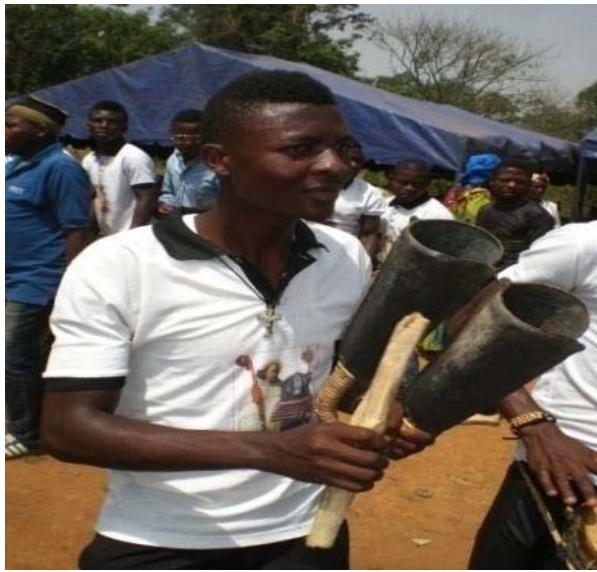 Ngitir elaborates on the strength and usefulness of gongs as follows; ngongs were beaten by kwifon on important occasions such as making of sacrificial offering to royal ancestors, when announcing the death of their member; when knighting a new member; when installing a kingmaker; sub-chief or quarter-heads; during burial proper of the above personalities; when commemorating an improperly buried member; when the Fon had disappeared (death of a Fon) and when sacrifices were made to late Fons.[^59] In Kedjom, the role of the gong remained vital and regular throughout the performance of religious rites. The double gong was also one of the sacred instruments and symbols of Kwifon, the regulatory society which served as the executive wing of most Grassfields traditional governments. It was the highest traditional authority in every Grassfields kingdom. The gong was thus beaten by kwifon members.[^60] From folklore, gongs became popular in the early nineteenth century under the reign of Fon Akumbu (c.1805-1835). The royal herald used it to announce the arrival of a Fon while the double gongs were used for messages and for music by church groups (see plate 4).[^61]