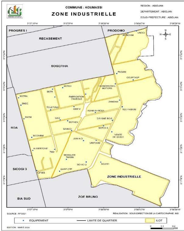 The commune of Koumassi is home to one of the largest industrial zones in Abidjan. It covers an area of 120 hectares, consisting of agri-food, plastics processing, and household goods manufacturing industries. According to the AGEDI census in 2019, the Koumassi industrial zone has 236 companies (AGEDI, 2019, p. 123).