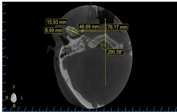 3. Angle between the long axial axis of the mandibular condyle and the median sagittal plane.