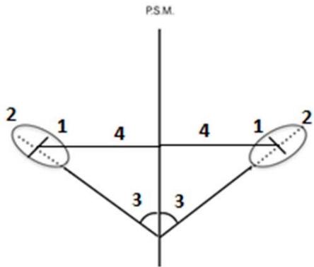 4. Distance between the geometric center of the condylar process and the median sagittal plane: measured by a line running from the geometric center of the condyle perpendicular to the median sagittal plane.