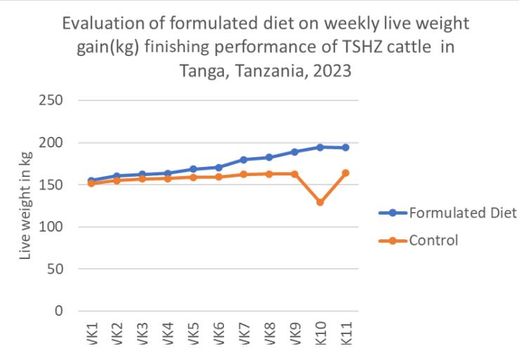 Figure 1: Evaluation of formulated diet on weekly live weight gain (kg) finishing performance of TSHZ cattle in Tanga, Tanzania