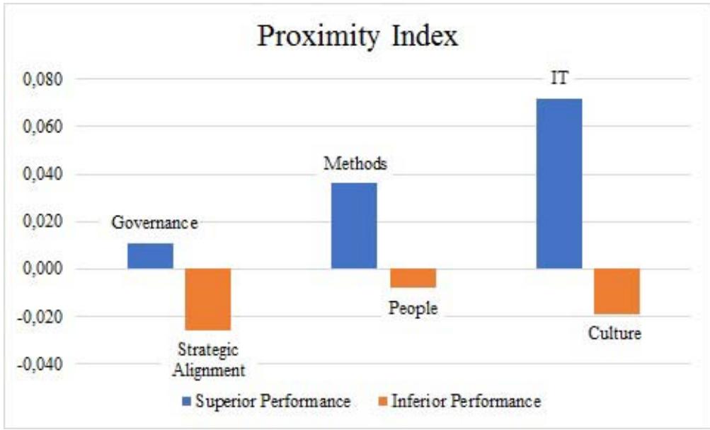 <table><tr><td></td><td>Strategic Alignment</td><td>Governance</td><td>Methods</td><td>IT</td><td>People</td><td>Culture</td></tr><tr><td>Reference DIPAT</td><td>0,098</td><td>0,121</td><td>0,148</td><td>0,169</td><td>0,055</td><td>0,086</td></tr><tr><td>Real DIPAT</td><td>0,126</td><td>0,110</td><td>0,112</td><td>0,097</td><td>0,063</td><td>0,105</td></tr><tr><td>Proximity index</td><td>-0,028</td><td>0,011</td><td>0,036</td><td>0,072</td><td>-0,008</td><td>-0,019</td></tr></table>
