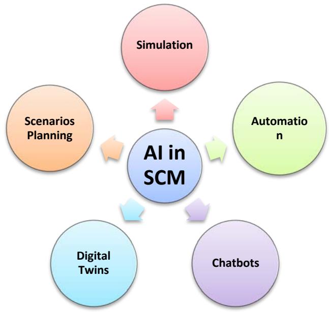 Automation, powered by AI, has transformed supply chain logistics by streamlining operations and reducing human intervention in routine tasks. AI algorithms can optimize routing, manage inventory levels, and forecast demand with high accuracy, leading to cost savings and improved service levels. For example, Al-driven automation in warehouses includes the use of robotics for sorting and packing, which accelerates order fulfilment and reduces errors. Companies like Amazon have invested heavily in robotics and AI to enhance their logistics operations. Amazon's advanced fulfillment centres utilize Al-powered robots to move goods efficiently, resulting in significant cost reductions and faster delivery times [36]. Also, AI-powered automation extends to transportation management. AI systems analyse traffic patterns, weather conditions, and delivery schedules to determine the most efficient routes for shipments [37, 38]. This optimization reduces fuel consumption, lowers transportation costs, and ensures timely deliveries, thereby enhancing customer satisfaction. Given an example, using AI Chatbots and Digital Twins in Predictive Supply Chain Management. These two represent innovative applications of AI in predictive supply chain management.