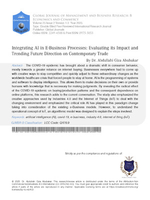Dr. Abdullahi Giza Abubakar. 2026. \u201cIntegrating AI in e-Business Processes: Evaluating its Impact and Trending Future Direction on Contemporary Trade\u201d. Global Journal of Management and Business Research - B: Economic & Commerce GJMBR-B Volume 25 (GJMBR Volume 25 Issue B2): .