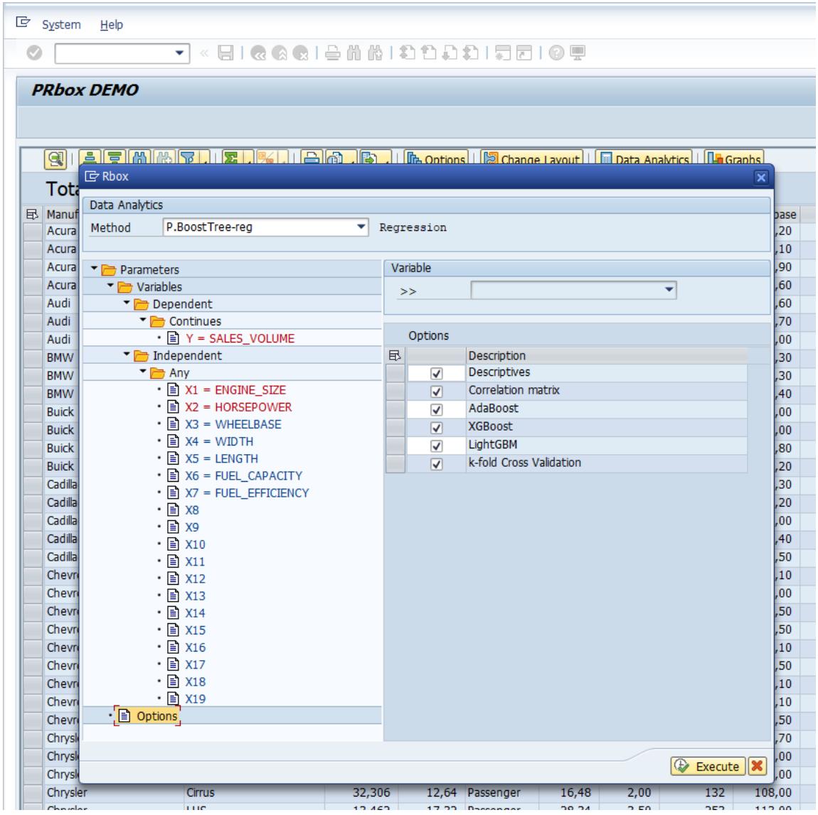 After importing the dataset in the Rbox+ Excel Client, the researcher can select the Data Analysis model (Regression, Classification, Clustering or Dimensionality Reduction) and the desired ML method. At this step, it is important to specify the response variable as well as the independent variables. Additional options can also be enabled, performing further calculations or plots useful during the analysis stage as shown in Figure 2. Moreover, Figure 3 illustrates the option of using the SAP S4Hana Client. The analyst can easily explore all the available ML Regression methods and trigger the execution accordingly.