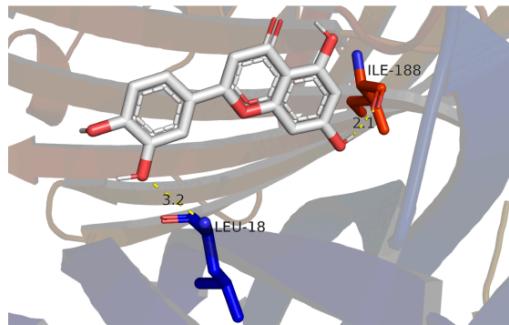 Fig. 8: The notable results of molecular docking analysis. aAction mode of quercetin with target JUN(PDB ID:5T01); bAction mode of quercetin with target MAPK3(PDB ID:4QTB); cAction mode of quercetin and MAPK1(PDB ID:7NR8); dAction mode of luteolin and TP53(PDB ID:7BWN)