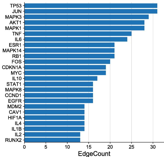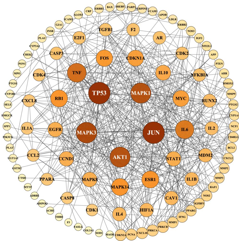 The PPI network (Fig. 4) displays 118 nodes and 467 edges, with an average node degree of 7.92. The PPI enrichment p-value is $< 1.0\mathrm{e} - 16$. The node degree indicates the number of edges of the target line. The higher the node degree, the more likely it is to be a key target of functional ingredients and play a significant role in the network. The nodes in the figure represent protein targets, and the edges represent protein-protein interactions. The more lines, the closer the relationship between targets. To illustrate this, the top 25 genes with the highest degree value were plotted in a histogram (Fig. 5), showing that TP53, JUN, MAPK3, MAPK1, and AKT1 are the most prominent proteins.