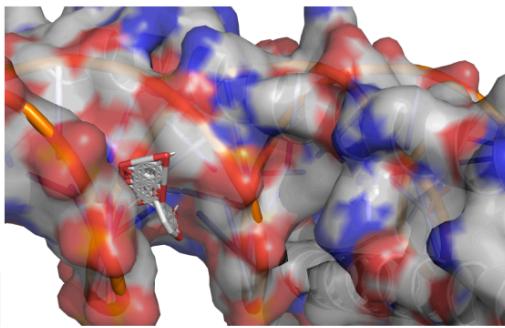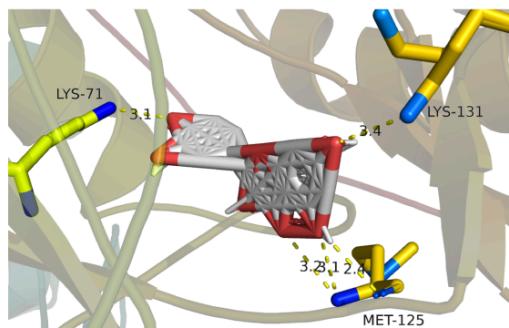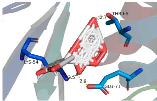 The top 5 core targets were respectively docked onto the top 4 vital chemicals. All docking simulations show good combination states. The affinity scores of TP53, JUN, MAPK3 and MAPK1 are slightly more ideal than AKT1. The representative ones in the docking results are TP53 with luteolin (-9kcal/mol), JUN with quercetin (-9.4kcal/mol), MAPK3 with quercetin (-10kcal/mol) and MAPK1 with quercetin (-9.5kcal/mol). These four receptors and their best docked ligands were picked out to draw the molecular docking diagram subsequently. Notably, MAPK3 also shows remarkable docking state with other 3 ligands. Its docking score with kaempferol, luteolin and acacetin are -9kcal/mol, -9.4kcal/mol, -9.2kcal/mol, respectively. The affinity scores heatmap and docking simulation images are shown in figure 7 and figure 8.