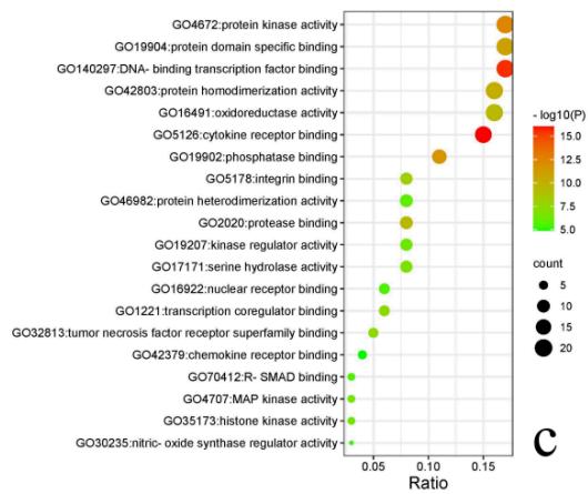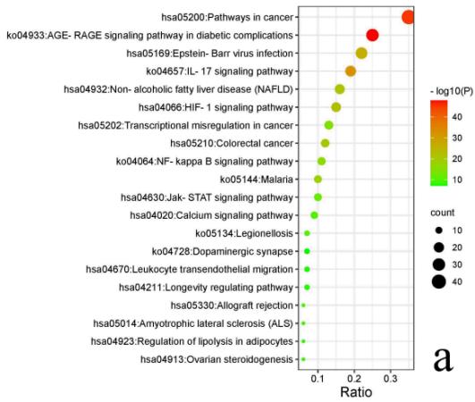 Enrichment result shows 431 cellular components (CC), 719 molecular functions (MF), 5365 biological processes (BP) and 455KEGG pathways. The top 20 significantly enriched entries in the results are arranged in an ascending order of p value (Fig. 6). The results showed important MF such as kinase binding, protease binding, cytokine receptor binding, DNA-binding transcription factor binding, kinase activity and cytokine activity; significant BP such as apoptotic signaling pathway, response to oxygen levels, regulation of inflammatory response, regulation of cellular response to stress and aging; important CC contains membrane, cytoplasm, endoplasmic reticulum, etc. The enrichment analysis results of KEGG pathways mainly manifested IL-17 signaling pathway (hsa04657), PI3K-Akt signaling pathway (hsa04151), HIF-1 signaling pathway (hsa04066), NF-kappa B signaling pathway (hsa04064), Jak-STAT signaling pathway (hsa04630), Calcium signaling pathway (hsa04020), Leukocyte transendothelial migration pathway (hsa04670), Regulation of lipolysis in adipocytes pathway (hsa04923) and Dopaminergic synapse pathway (hsa04728).