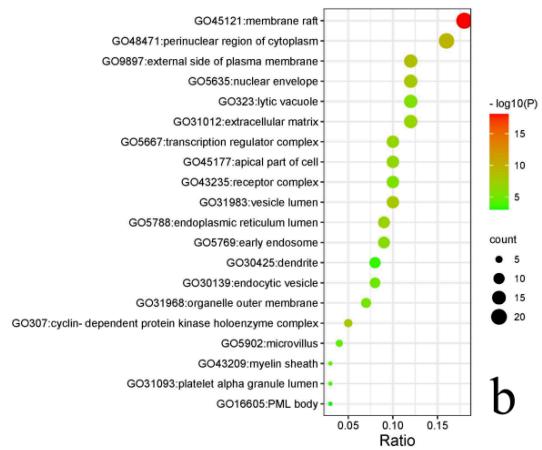a Enrichment analysis results of KEGG pathways; b Enrichment analysis results of CC; c Enrichment analysis results of MF; d Enrichment analysis results of BP. Size and color of the dots represent the degree of GO enrichment analysis.