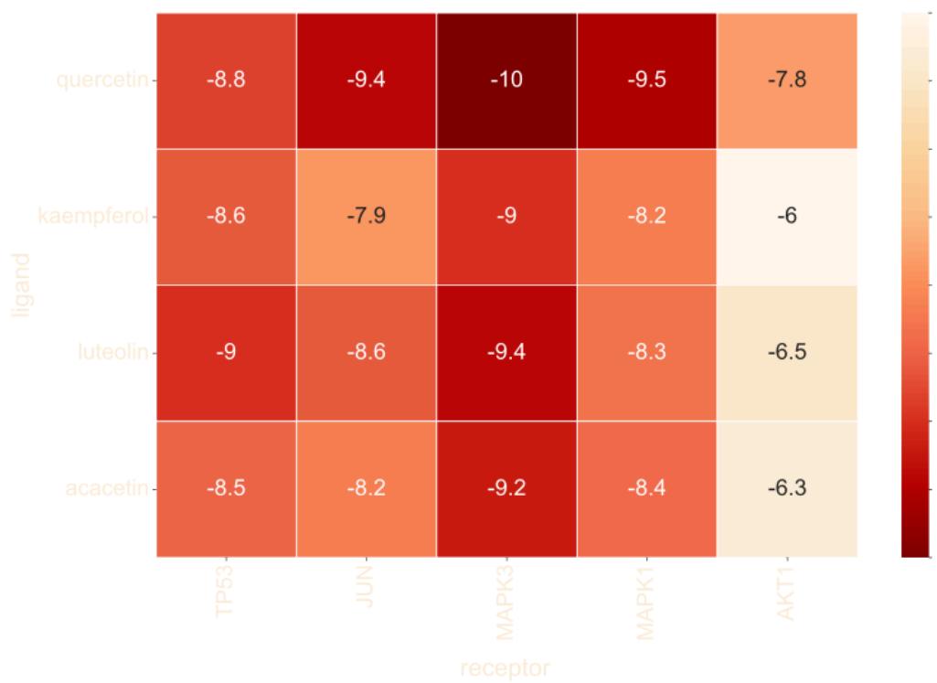We chose the top 5 proteins ranked by degree as protein receptors. The 3D structure of TP53, JUN, MAPK3, MAPK1 and AKT1 were downloaded from PDB database (https://www.rcsb.org). Then, we use PyMOL 2.5.2. software to remove the organics and solvent. 3D structures of the top 4 vital compounds were downloaded from PubChem database (https:// pubchem.ncbi.nlm.nih.gov). Additionally, molecular docking was performed using Autodock-Vina. TP53, JUN, MAPK3, MAPK1 and AKT1 were docked with quercetin (MOL000098), kaempferol (MOL000422), luteolin (MOL000006) and acacetin (MOL001689) respectively. The affinity score smaller than 0 indicates that the ligand and receptor can bind spontaneously. It is generally believed that the components with lower scores are the active ones interacting with the protein. Matrix heatmap was plotted by http://www.bioinformatics.com.cn, a free online platform for data analysis and visualization. At last, the docking results were analyzed by using PyMOL 2.5.2.
