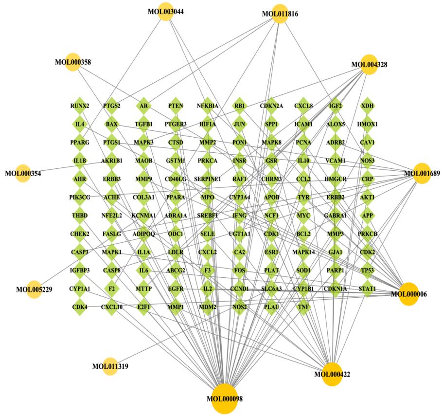 Fig. 3: The compound-target network of Chrysanthemum on dry eye. Yellow solid circles represent compounds and green diamonds represent targets.