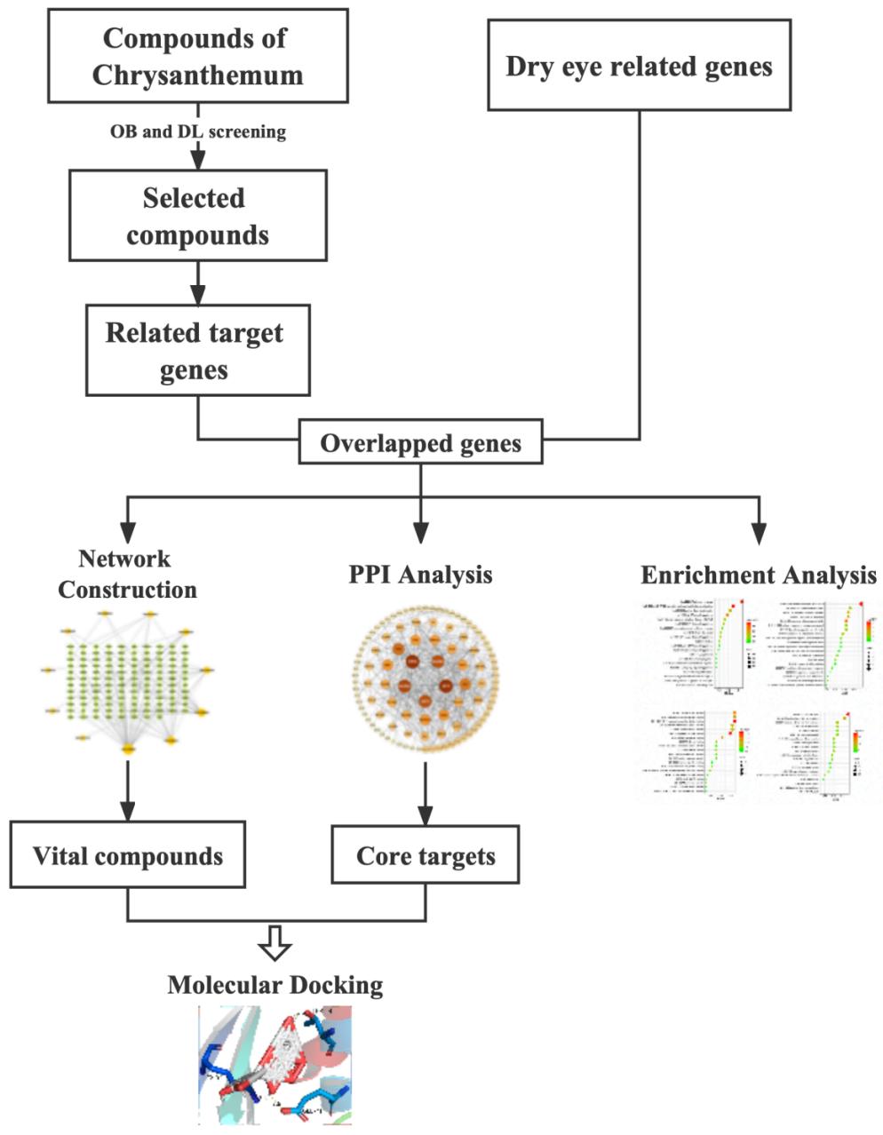 Network pharmacology combined with molecular docking is a common method to study the effects of drugs on diseases. Network pharmacology is based on a network composed of chemicals, targets, and pathways, which combines computer science with medical science [11]. Its application in CM provides compelling evidence for the protein targets and potential mechanism of CM in the treatment of diseases. Additionally, molecular docking is a frequently used docking simulation method for predicting the optimal interaction of molecules. Our study aims to clarify the molecular targets and potential mechanism of chrysanthemum against dry eye by utilizing network pharmacology. Furthermore, we use molecular docking to simulate the binding mode of receptor proteins and ligands.