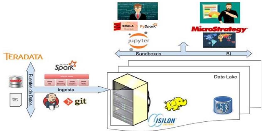 This article describes the integration from big data environment in the management of products and services from a banking entity with optimizing financial products and decisionmaking. Actually, there are many financial entities where their different business areas have isolated databases, causing greater consumption of computer resources, maintainability and, in many cases, process delays. This problem becomes critical specially if there is a transnational company because data needs can vary geographically despite being the same functional area. The Data Architecture area proposed guidelines such as centralizing information in a big data environment, ensuring progressive accessibility from users for new financial analytics initiatives and thereby reducing isolated data. The agile, Scrum framework supported the advanced analytics pilot which comprising developments in the data ingestion layer (data lake) through the distributed processing from Apache Spark; and information consumption through Sandboxes, which one, users performing the analysis, visualization and prediction from data.