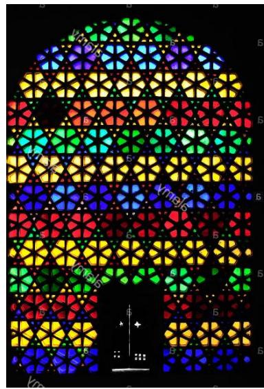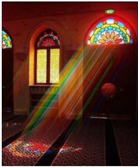 Fig. 7.1: Colorful glass window (qamaria) in the Yemeni buildings interior design and the integration of its performance, functional and expressive elements is a characteristic of all surfaces. Modern studies of color have greatly influenced interior design, so the color is no longer in the same traditional concept as a layer of paint or a material for decoration and means of entertainment, but rather color has become one of the material's characteristics and is inseparable from it. Moreover, Color is a physical phenomenon, and its main sources are light and visuals in nature, and it is characterized by three main factors that are interconnected between them. A) Color trait: as it represents the basic colors that are mixed in different proportions giving all other colors. B) Colorvalue: It is the optical value of a color in relation to the extent of its whitenessor darkness, and that is through the degree of reflection of the incident light. C) Color intensity: the degree of purity and concentration of the color characteristic that extends from neutral gray to pure white. However, these factors can be changed by using pigments or by the effect of light falling on them. And far from its visible aspects, color can affect the design elements, their proportions and their relationship. Consequently, the interior design of the spaces requires taking into account the visual effects of color represented by: a) The influences of the form that take into account the aspects related to aesthetics.