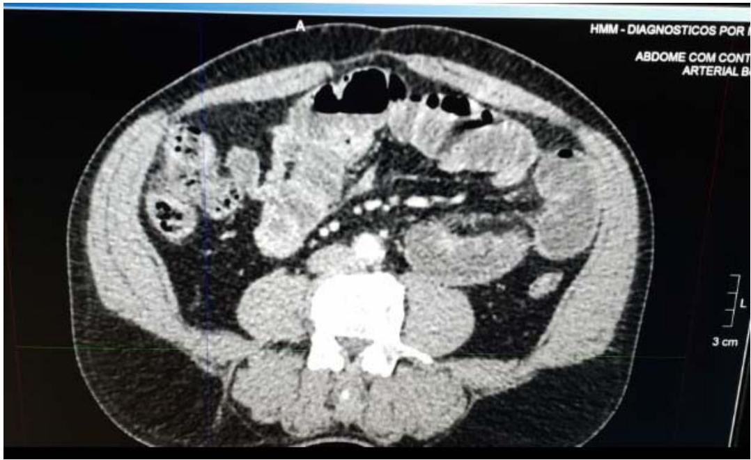 a) Elementos De Apoio Para Analise Dos Resultados E Discussao i. Tabelas, quadros, figuras e quadros: Imagem 1: Tomografia Computadorizada (TC) do caso relatado tomografia computadorizada (TC), ultrasonografia endoscópica e endorretal (USER), ressonência nuclear magnética (RNM) e videocápsula endoscópica pode ser úteis para diagnóstico, localização e estadiamento da doença.[24]