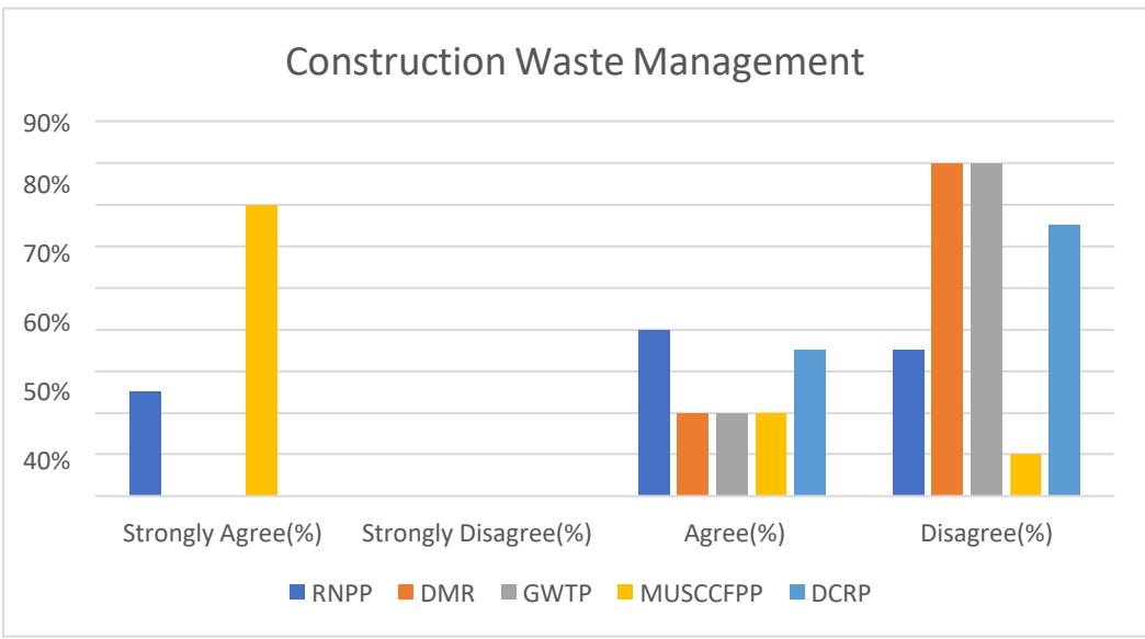 From the questionnaire survey in those five projects, we found that almost all projects have challenges in construction wastage management where the project MUSCCFPP has to face the most challenges for the sea beach area. Actually, it's dependent on the project location.