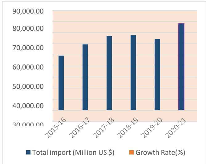 <table><tr><td>Year</td><td>Total import (Million the US $)</td><td>Growth Rate (%)</td></tr><tr><td>2015-16</td><td>49,436.00</td><td>5.41</td></tr><tr><td>2016-17</td><td>59,561.00</td><td>21.79</td></tr><tr><td>2017-18</td><td>67,133.00</td><td>16.96</td></tr><tr><td>2018-19</td><td>68,103.00</td><td>3.83</td></tr><tr><td>2019-20</td><td>64,186.00</td><td>-4.91</td></tr><tr><td>2020-21</td><td>78,211.00</td><td>21.89</td></tr></table>