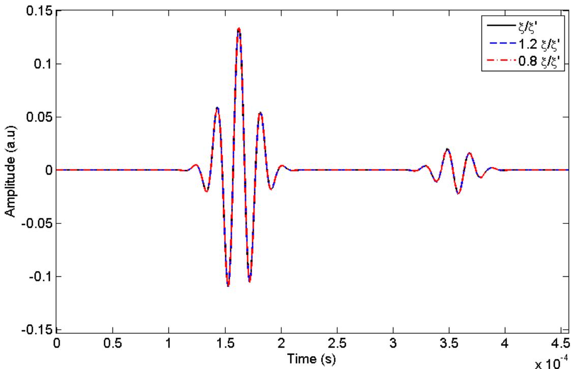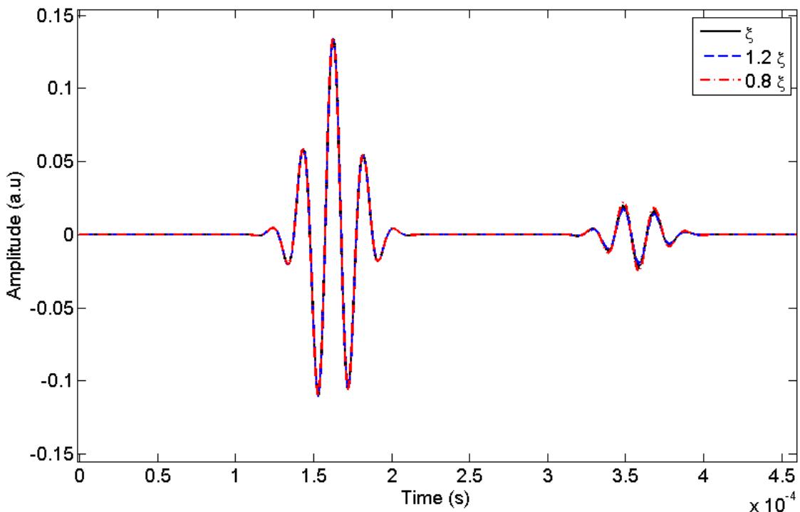 The sensitivity of the shape factor $\xi$ on the 1st and 2nd reflected waves in the Low-Frequency Ultrasound regime is presented in Figure 7. According to this figure, a $-20\%$ variation of $\xi$ results in a regression of $-0.26\%$ and $-4.89\%$ in the amplitude of the 1st and 2nd reflected waves, respectively. For a variation of $+20\%$ of $\xi$, we observe a growth of $+0.17\%$ and $3.29\%$ in the amplitude of the 1st and 2nd reflected waves. It can be concluded that the shape factor $\xi$ has a weak influence on the first reflected wave but a strong sensitivity on the second wave in the low-frequency range of ultrasound. Moreover, the variation decreases for the first reflected wave and increases for the second wave as the frequency increases.