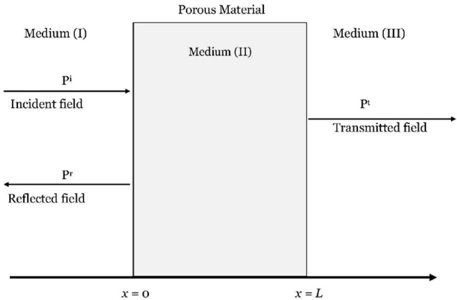 Consider a homogeneous porous material that occupies the region $0 \leq x \leq L$. A sound pulse normally strikes the medium, generating an acoustic pressure field $p(x,t)$ and an acoustic velocity field $v(x,\omega)$ within the material (Fig. 1). These fields satisfy the Euler equation and the constitutive equation along the $x$ -axis: