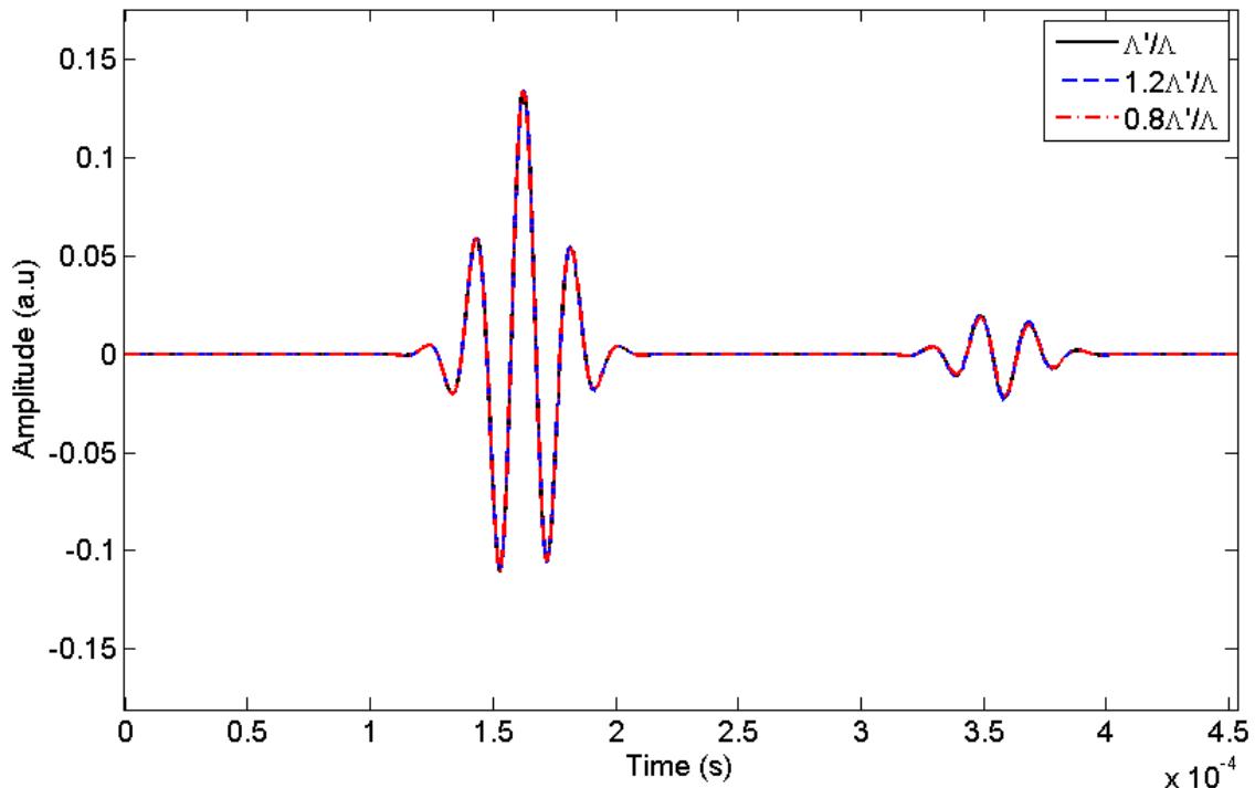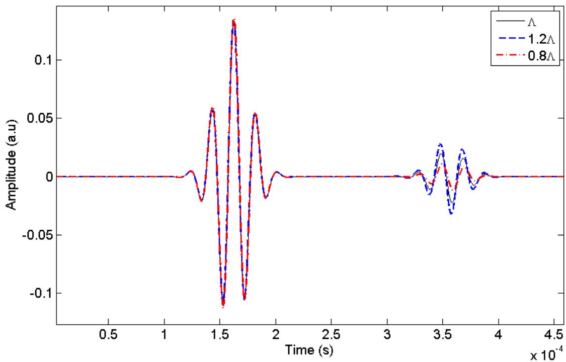 The impact of varying the viscous characteristic length on the 1st and 2nd reflected waves at high frequency is shown in Figure 5. With an excitation frequency of $50\mathrm{kHz}$, a $+20\%$ change in $\pmb{\Lambda}$ results in a $-1.07\%$ decrease in the amplitude of the first reflected wave and a $42.76\%$ increase in the amplitude of the second reflected signal. Furthermore, as the frequency increases, the sensitivity of the viscous characteristic length decreases for the 1st reflected wave and increases for the 2nd reflected wave. Therefore, we can conclude that the viscous characteristic length has a relatively small influence on the 1st reflected wave at high frequency but a high sensitivity on the 2nd reflected wave.