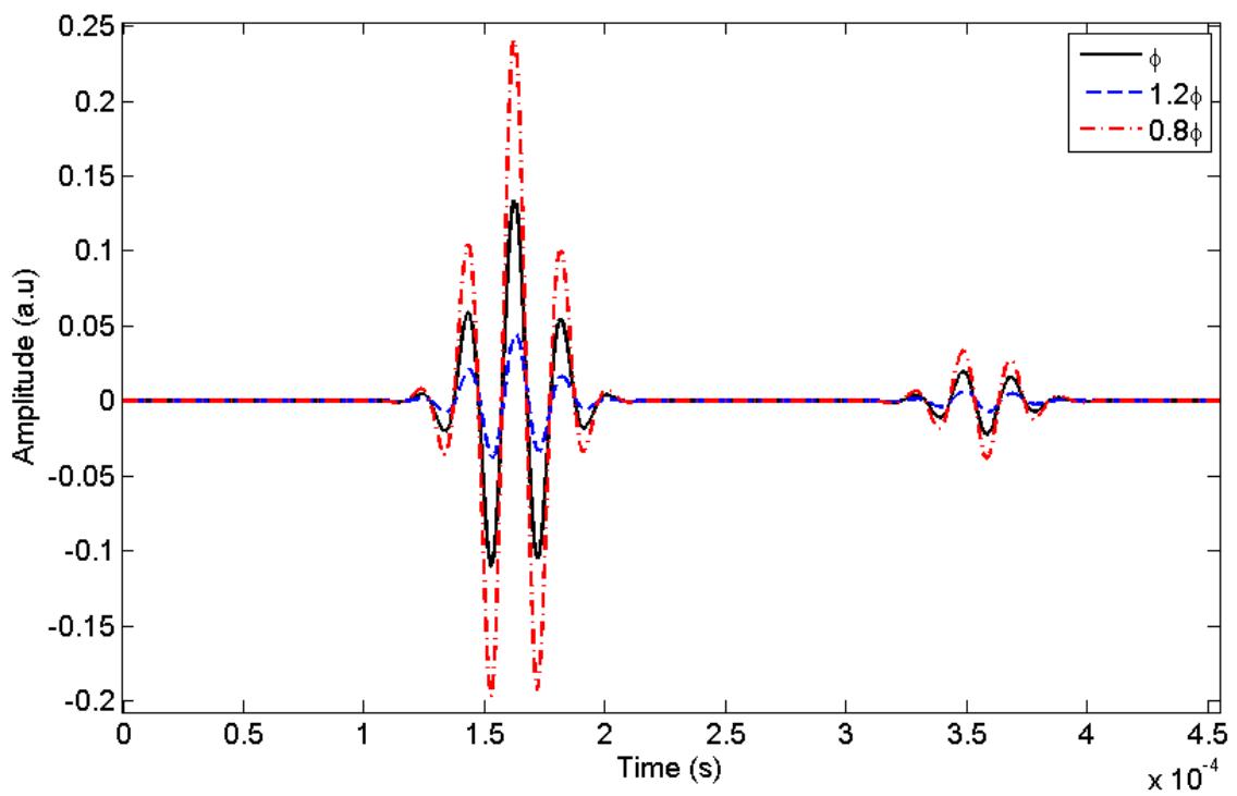 Figure 3: Sensitivity of porosity $\phi$ on the 1st and 2nd reflected signals at $50\mathrm{kHz}$