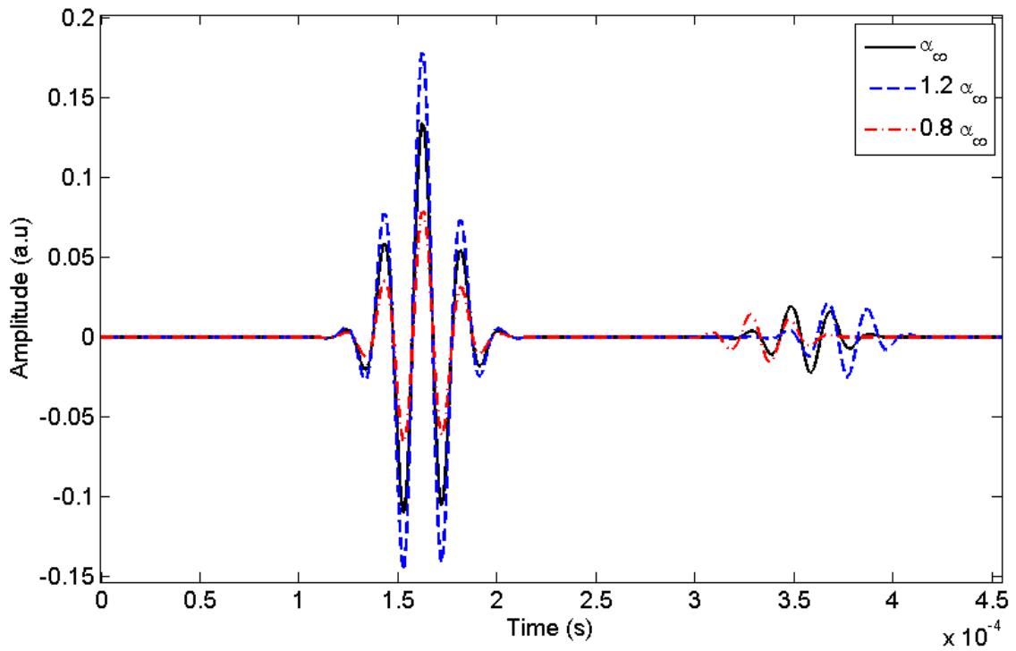 Figure 4 illustrates the sensitivity of tortuosity $\alpha_{\infty}$ on the 1st and 2nd reflected waves, for an excitation pulse of frequency $50~\mathrm{kHz}$. When the initial tortuosity value is increased by $+20\%$, the amplitude of the 1st and 2nd reflected waves increases by $+33.16\%$ and $10.82\%$, respectively. Conversely, a decrease of $-20\%$ in tortuosity results in a decrease in the amplitude of the 1st and 2nd reflected waves by $-40.98\%$ and $-27.47\%$, respectively. Notably, the impact of tortuosity is more pronounced on the 1st reflected signal than on the 2nd. Additionally, the sensitivity of tortuosity to the reflected signal increases with frequency, as detailed in Table 1.