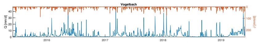 Figure 5: Vogelbach catchment: Four years time series (June 2015-May 2019) of daily stream discharge [mm/d] and precipitation [mm/d], temperature